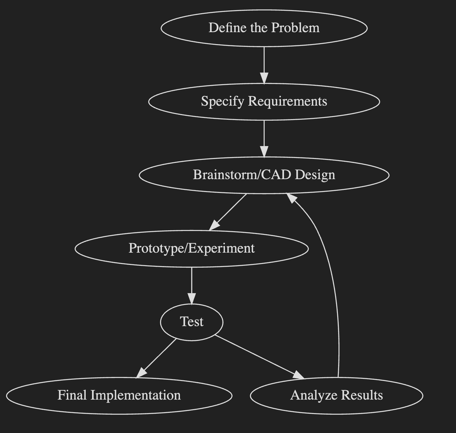 Trình bày quy trình thiết kế kỹ thuật theo từng bước: xác định vấn đề, nghiên cứu, lên ý tưởng, thiết kế, chế tạo, thử nghiệm, cải tiến.