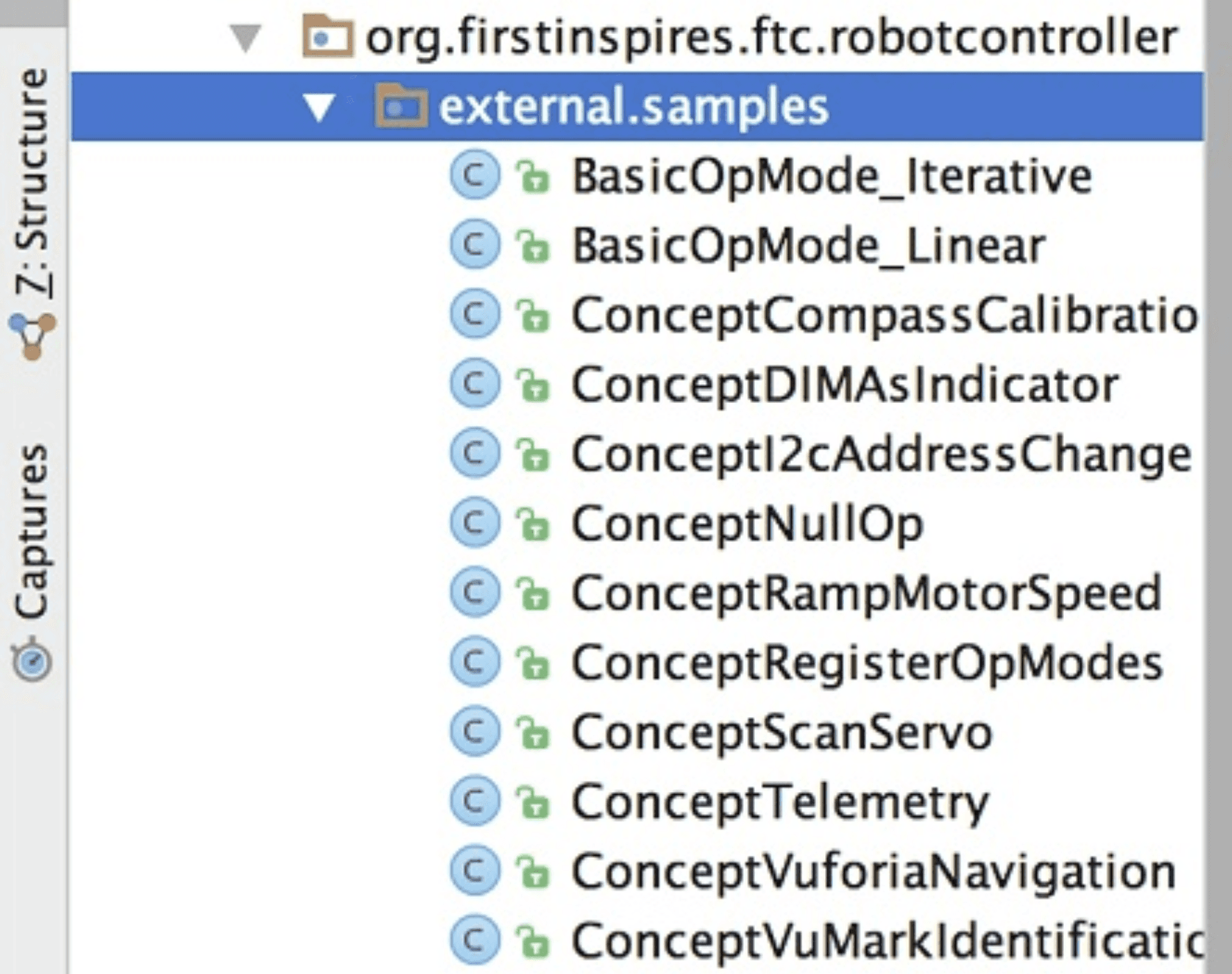 Một cách tuyệt vời để học lập trình robot là xem xét các OpMode mẫu được cung cấp trong thư mục dự án Android Studio. Ta có thể tìm thấy các tệp này trong mô-đun FtcRobotController, tại gói org.firstinspires.ftc.robotcontroller.external.samples.
