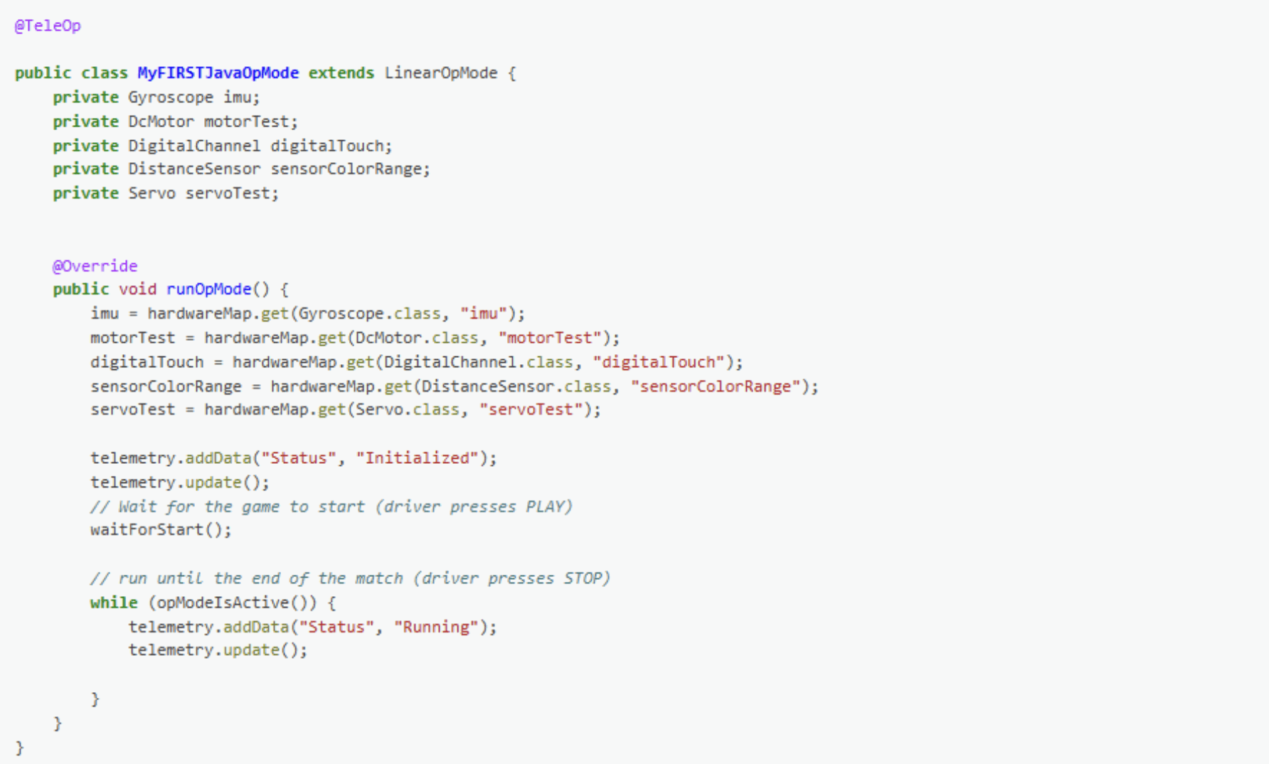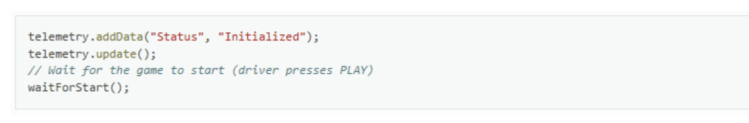 Trong vài câu lệnh tiếp theo của ví dụ, OpMode yêu cầu người dùng nhấn nút bắt đầu để tiếp tục. Nó sử dụng một đối tượng khác có sẵn trong phương thức runOpMode, gọi là telemetry. OpMode sử dụng phương thức addData để thêm một thông điệp gửi đến Driver Station. Sau đó, OpMode gọi phương thức update để gửi thông điệp đến Driver Station. Tiếp theo, nó gọi phương thức waitForStart để đợi cho đến khi người dùng nhấn nút bắt đầu trên Driver Station để bắt đầu chạy OpMode.