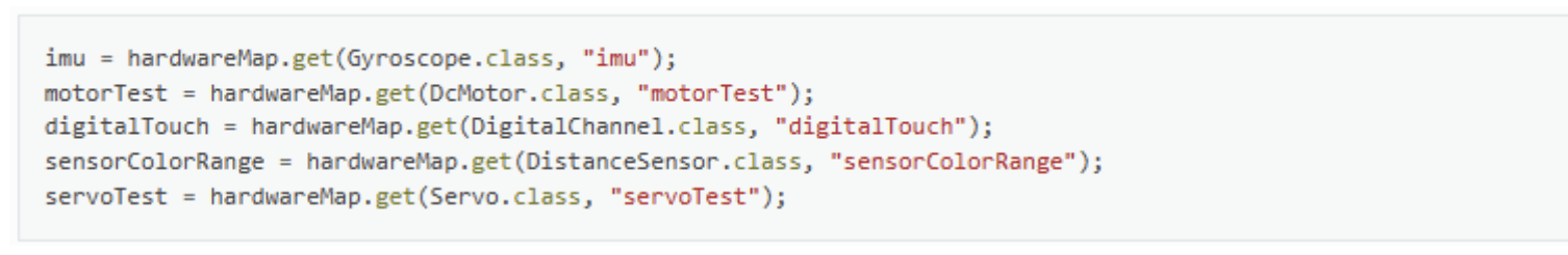 Lưu ý rằng khi bạn cố gắng lấy tham chiếu đến một thiết bị cụ thể trong OpMode, tên bạn chỉ định trong đối số thứ hai của phương thức HardwareMap.get phải khớp chính xác với tên được sử dụng để định nghĩa thiết bị trong tệp cấu hình. Ví dụ, nếu bạn đã tạo một tệp cấu hình với một động cơ DC tên là motorTest, thì bạn phải sử dụng đúng tên này (phân biệt chữ hoa chữ thường) để lấy động cơ từ đối tượng hardwareMap. Nếu tên không khớp, OpMode sẽ ném ra một ngoại lệ, báo rằng không thể tìm thấy thiết bị.