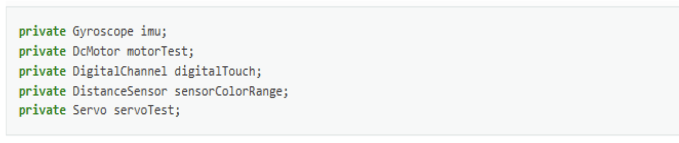 Bạn cũng có thể thấy rằng trình chỉnh sửa OnBot Java đã tạo ra năm biến private cho OpMode này. Các biến này sẽ chứa tham chiếu đến năm thiết bị đã được cấu hình mà trình chỉnh sửa OnBot Java phát hiện trong tệp cấu hình của Robot Controller.