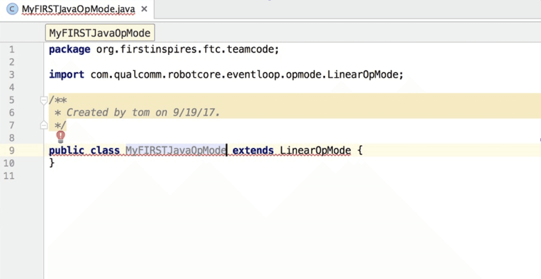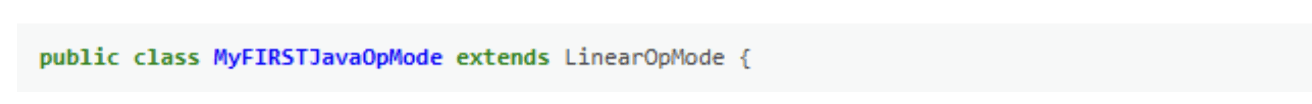 Từ mã mẫu, bạn có thể thấy rằng một OpMode được định nghĩa là một lớp Java. Trong ví dụ này, OpMode có tên là MyFIRSTJavaOpMode và nó kế thừa các đặc tính từ lớp LinearOpMode.