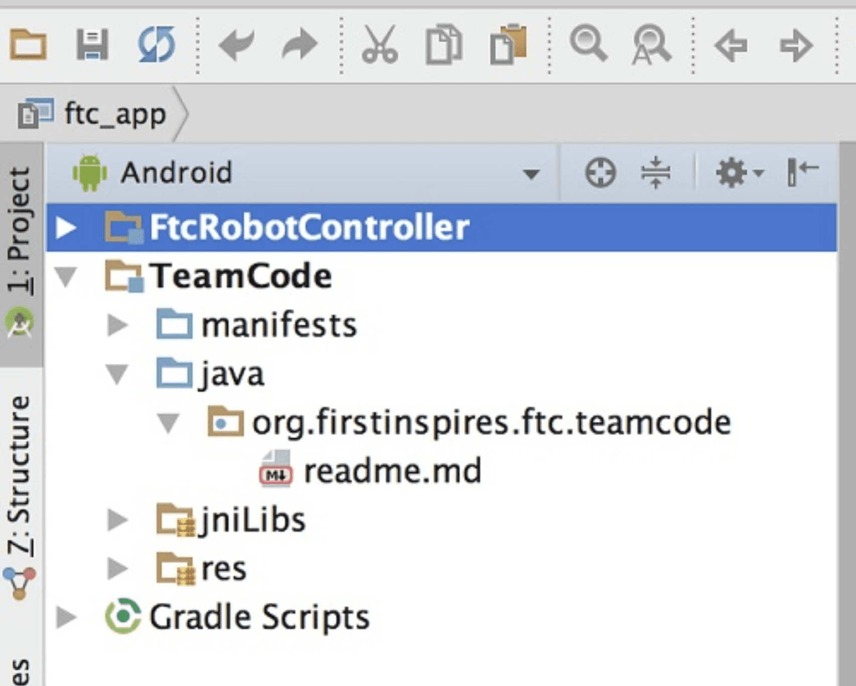 Sau khi nhập thành công thư mục dự án Android Studio, ta sẽ thấy trong trình duyệt dự án một mô-đun Android có tên TeamCode. Thư mục dự án này sẽ được sử dụng để tạo một phiên bản của ứng dụng Robot Controller, bao gồm các OpMode tùy chỉnh mà ta sẽ viết để điều khiển robot thi đấu.