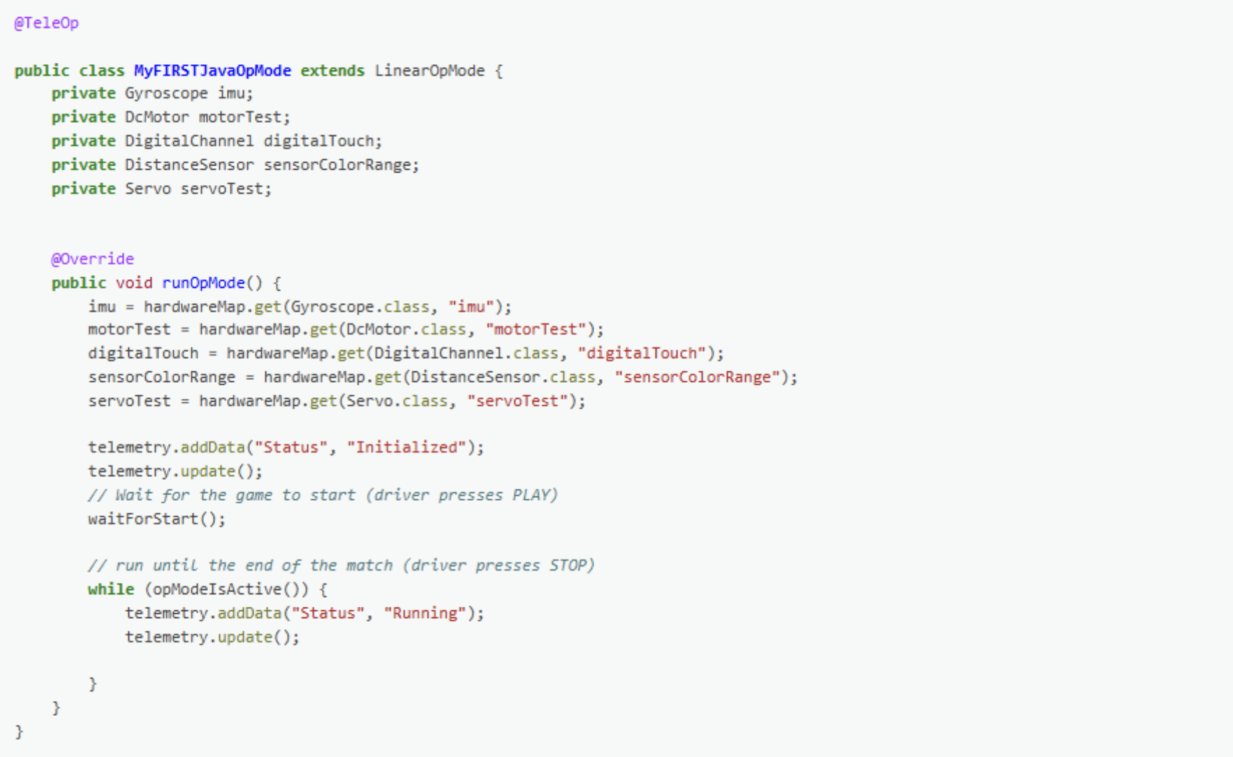 Hãy chỉnh sửa phần chính của OpMode để nó trông giống như đoạn mã sau (lưu ý: định nghĩa gói và một số câu lệnh nhập đã được lược bỏ trong mã nguồn dưới đây):