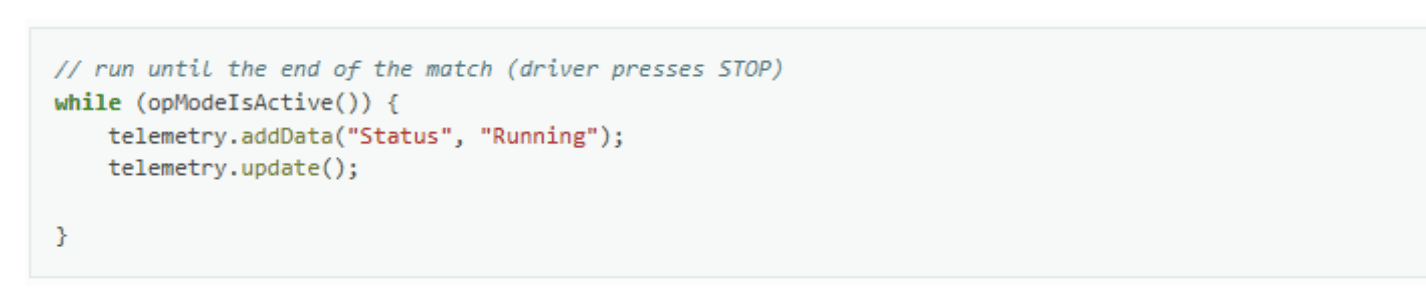 Sau khi nhận được lệnh bắt đầu, OpMode sẽ đi vào một vòng lặp while và tiếp tục lặp lại trong vòng lặp này cho đến khi OpMode không còn hoạt động (tức là cho đến khi người dùng nhấn nút dừng trên Driver Station):