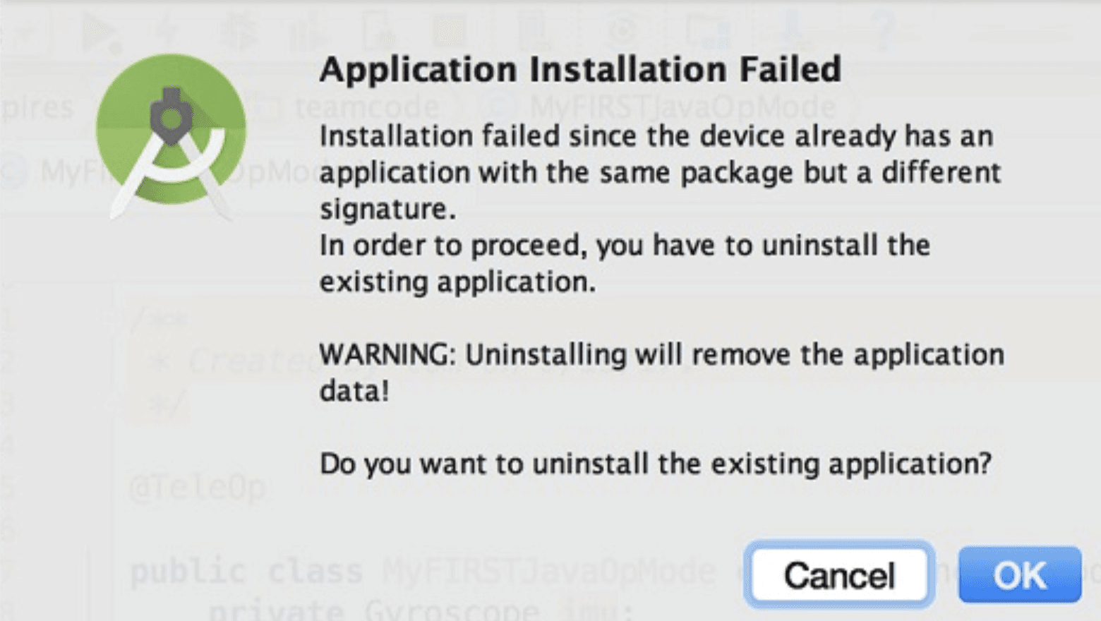 Nếu điều này xảy ra, Android Studio sẽ hỏi bạn liệu có đồng ý gỡ cài đặt phiên bản trước (chính thức) của ứng dụng trên thiết bị và thay thế bằng phiên bản mới hay không. Chọn OK để gỡ cài đặt phiên bản trước và thay thế bằng ứng dụng Robot Controller mới mà bạn vừa tạo (xem hình ảnh trên).