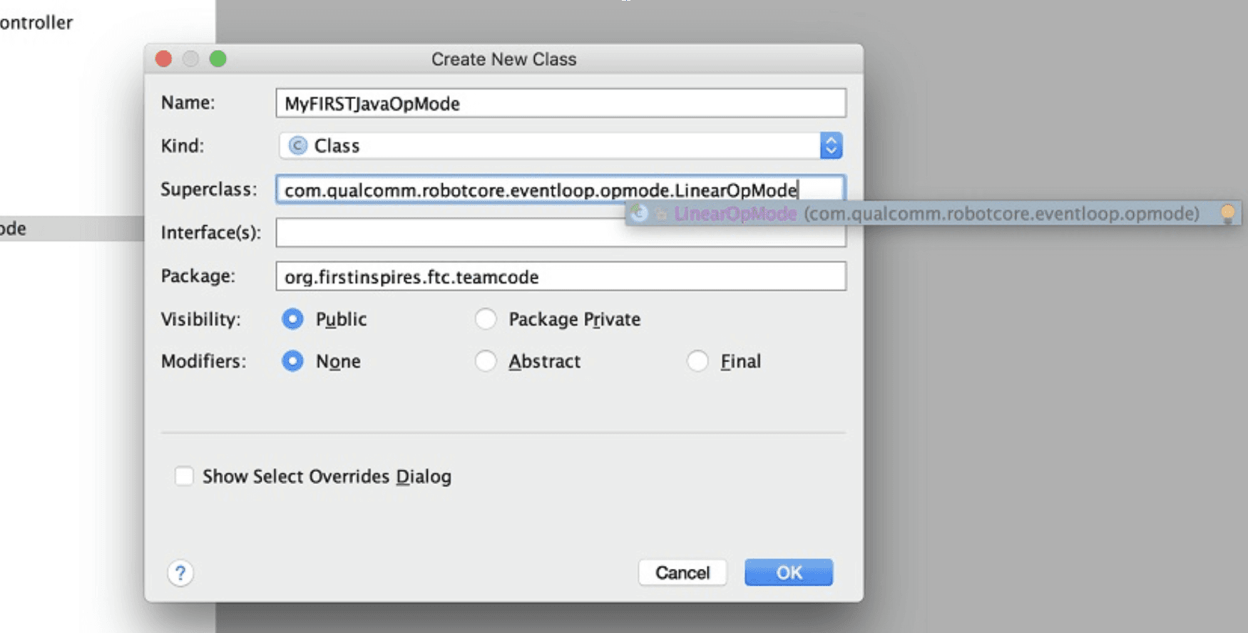 Nhấp chuột phải vào gói org.firstinspires.ftc.teamcode và chọn New -> Java Class từ menu hiện ra. Hộp thoại Create New Class sẽ xuất hiện. Đặt tên cho lớp mới là MyFIRSTJavaOpMode và chọn lớp cha là LinearOpMode trong gói com.qualcomm.robotcore.eventloop.opmode.